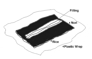Place a sheet of Saran wrap the same size as the bamboo rolling mat. If you don’t have one just use the saran wrap to roll. Wet hands with cold water and lightly dry your hands. Slightly wet hands means the rice will stick less to your hands.