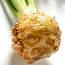 Celeriac, also known as celery root,  is an odd looking root vegetable with its knotty exterior.  Celeriac has a celery flavor and can be eaten raw or cooked.  It is often used as a flavoring in soups and stews. It can also be used on its own, usually mashed, or used in casseroles, gratins and baked dishes.  When purchasing fresh celeriac, choose only those with firm and small to medium-sized roots. Selecting smaller roots is better because smaller roots produce a more flavorful root taste. Additionally, although celeriac stalks and leaves are typically not eaten, make sure that the celeriac you purchase has leaves that are green and not wilted. Once you have purchased your celeriac, store it in the refrigerator for up to one week and make sure to remove its stalks and leaves first.  Celeriac is a good source of Vitamin C, Vitamin K, Phosphorus, Potassium, Dietary Fiber, Vitamin B6, Magnesium and Manganese.