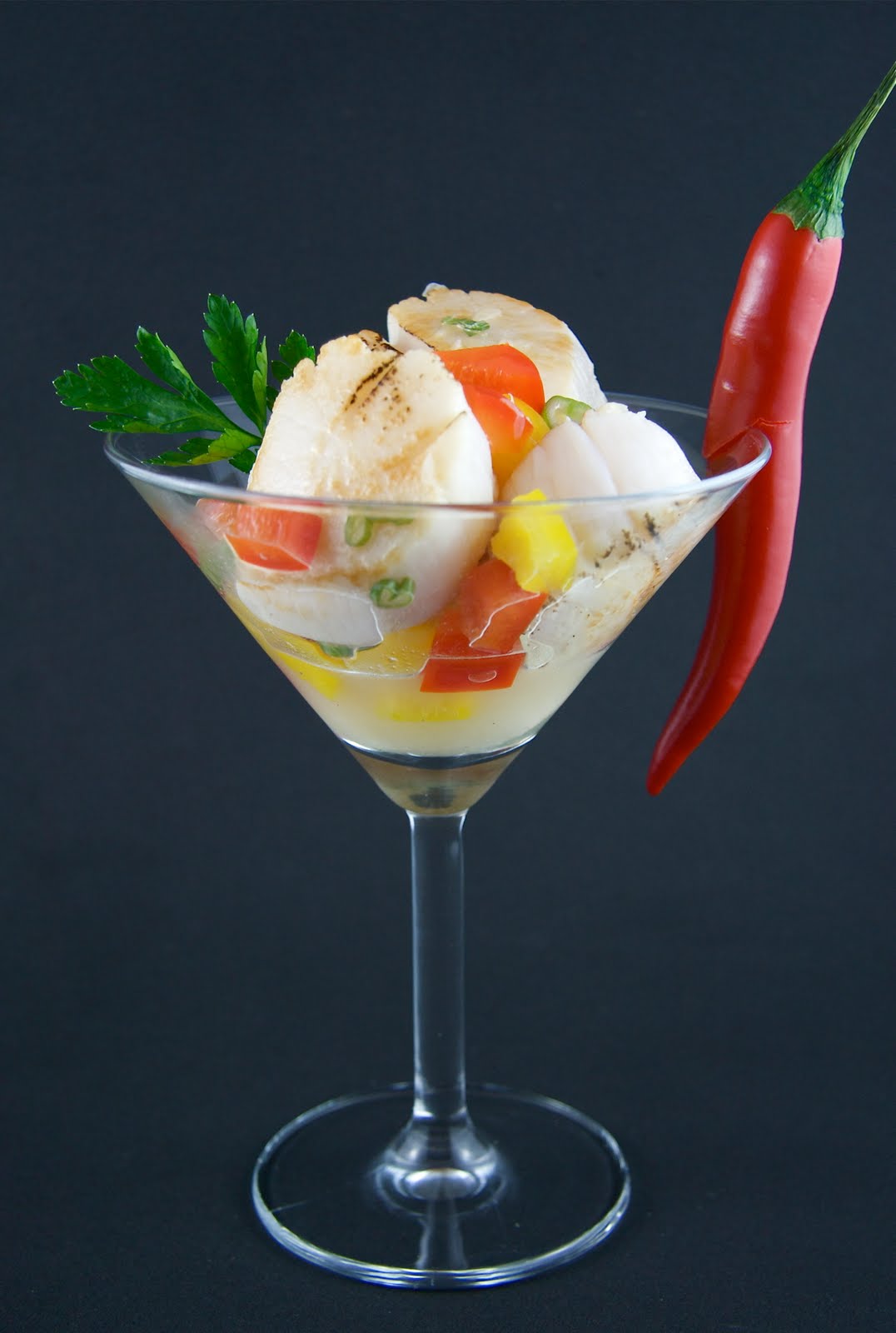 Wow! This is what I call ceviche party style! Not only does the lime juice marinate the scallops, the alcohol also adds another delicious flavor. Digby, Nova Scotia is famous for its scallops and bills itself as the scallop capital of the world. Scallops are Nova Scotia’s most valuable seafood catch and Digby is the home of the world’s largest inshore scallop fleet. These scallops are huge! I saw this recipe in the Occasions Magazine which is a food and drink periodical produced by the liquor control boards of Nova Scotia, New Brunswick, Newfoundland, Prince Edward Island and Alberta. The Nova Scotia issue highlights local restaurants and showcases their award winning recipes. I love the fleshy texture and sweet flavor of scallops. But these gems are not only delectable, they contain a variety of nutrients that can promote cardiovascular health, plus provide protection against colon cancer. Click here for more nutritional information. If like this recipe, you might also want to try Marinated Seafood Salad, Scallops with Sauce Vierge, or Scallops with Tomato Crust on rich Shellfish Cream