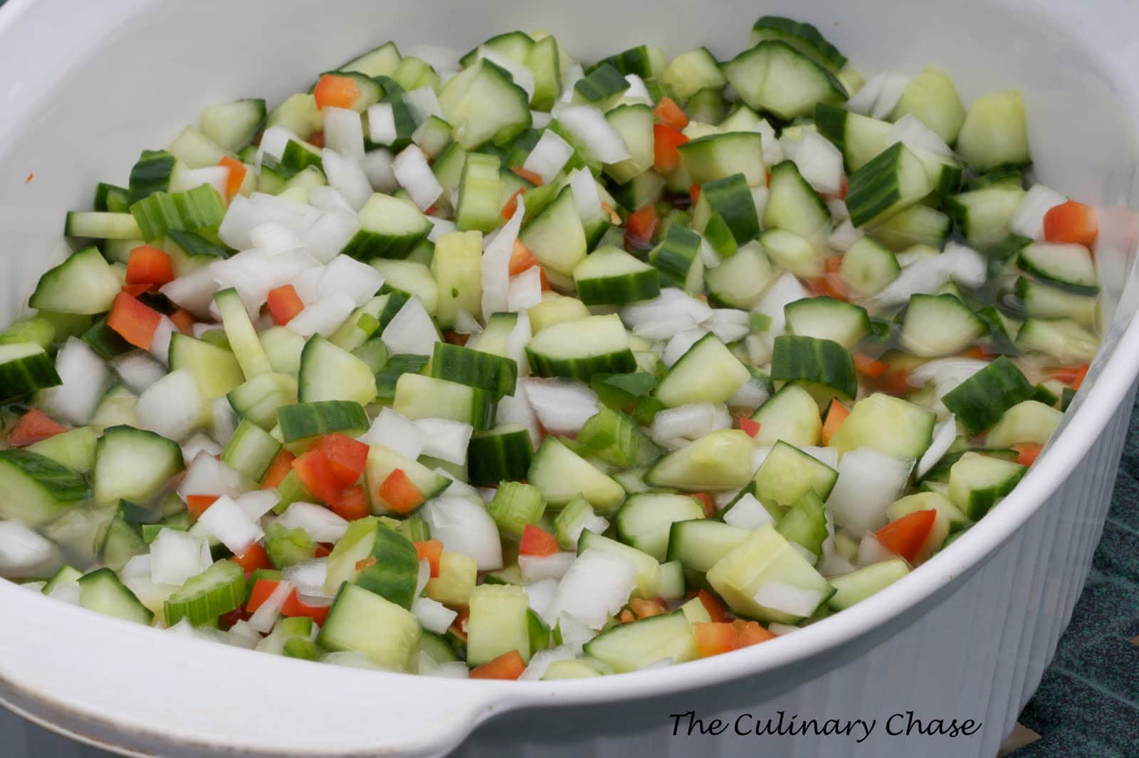 Note: To properly prepare cucumbers, slice lengthways and, using a spoon, remove pulpy seeds from the center. Do not peel. Dice into pieces about 1/2 inch (1cm) square.