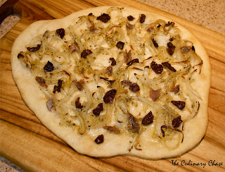 For the topping, heat oil in a large frying pan over medium heat. Add onions, sugar, salt and pepper. Cook for 10 minutes then start to stir around. The onions are to stay white and not browned.  Cover and cook over medium low heat 15-20 minutes until you achieve a marmalade-like consistency.
