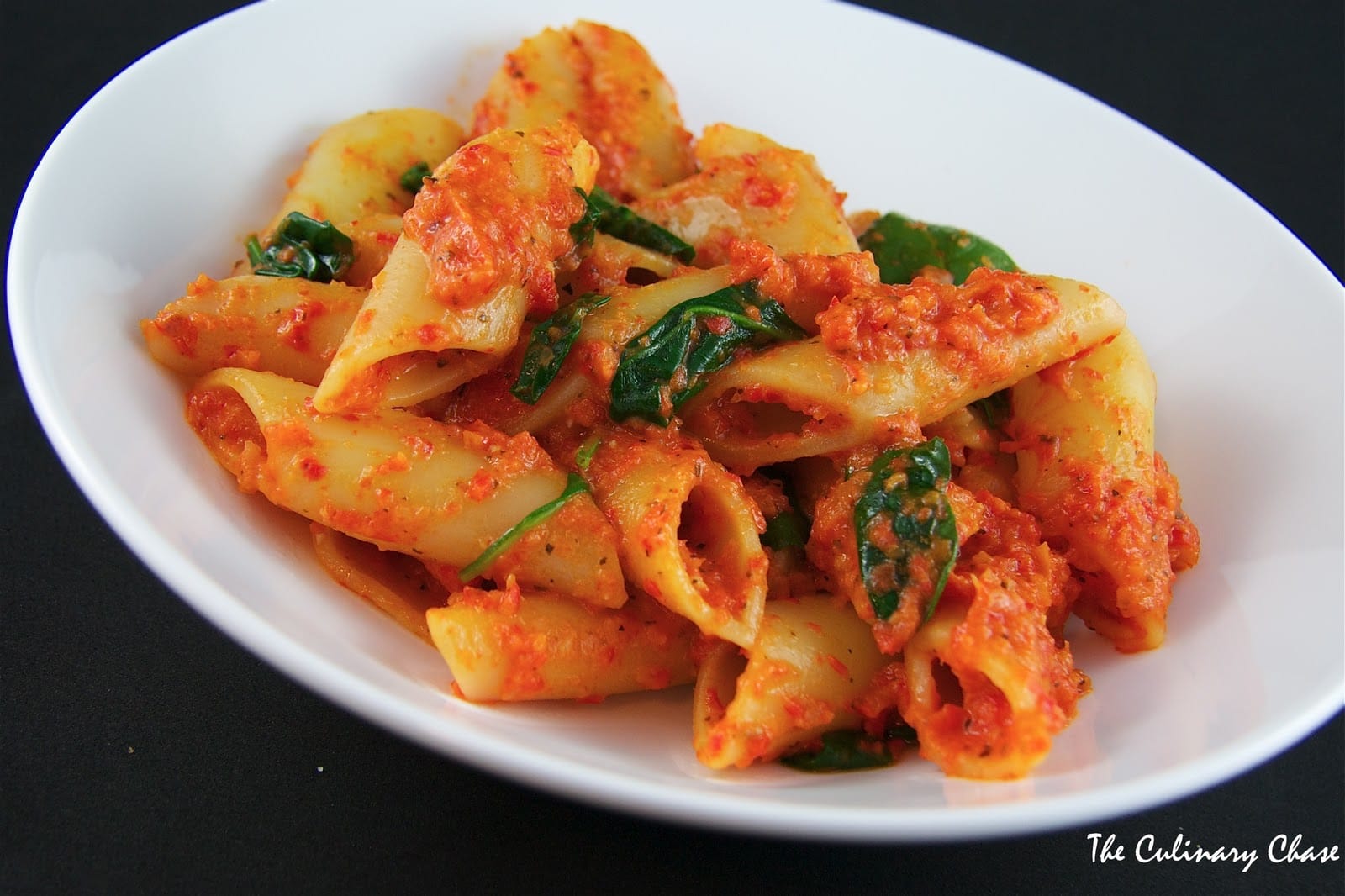 The Culinary Chase’s Note: Gorgeous flavors in the red pepper sauce with hints of garlic coming through! I like using pennoni (a larger sized penne) as it captures more of the sauce inside. For an added zing, toss in crushed red pepper flakes. If you have any sauce left over, use it as a dip with veggies and artisan crackers.