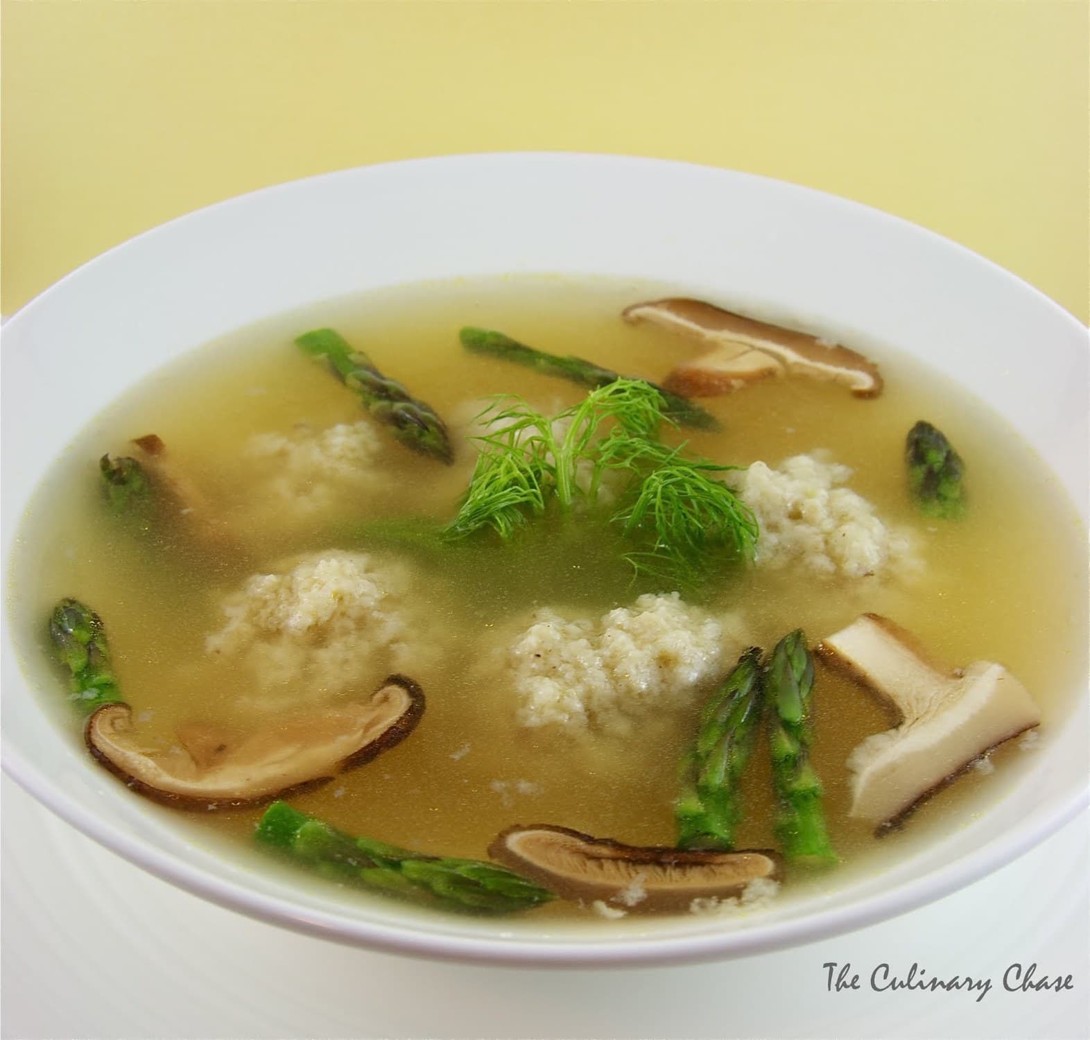 Chicken Soup with Asparagus and Shiitake, served with Roasted Fennel Matzoh Balls
