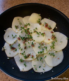 The Culinary Chase’s Note:  I bought a rather large piece of pork fillet (no little ones to be found the day I went food shopping) and adjusted the cooking time from 12 minutes to 17 minutes. If you’re not a fan of pork or veal, you could also use chicken. If you don’t have oven-proof pans, cover the handles with tin foil.  Don’t worry if the potatoes don’t brown up on the top as the bottom will.  When it comes time to serve the potatoes, remove a chunk and flip over onto the plate such that the browned side shows.  Lovely, earthy flavors from this dish! Bon appétit!