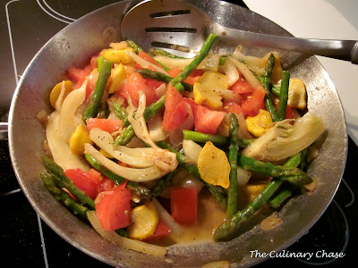 In a saucepan, melt butter over medium heat and add onions. Sauté for a couple of minutes and add fennel. Cook until fennel is al dente before adding sliced squash. Cook for about 2 or 3 minutes and add asparagus and tomato. Add a splash of white wine to enhance the flavor of the veggies as well as keeping them moist. Cook 5 minutes or until vegetables are slightly soft.