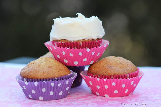 The Culinary Chase’s Note: I have my all-time favorite banana cake recipe from The Fannie Farmer cookbook that I use when bananas become too ripe. A long time ago I started adding semi-sweet chocolate chips. However, this cupcake recipe is so easy to make and the frosting is akin to the crowning of a royal subject! It’s that good! Enjoy!