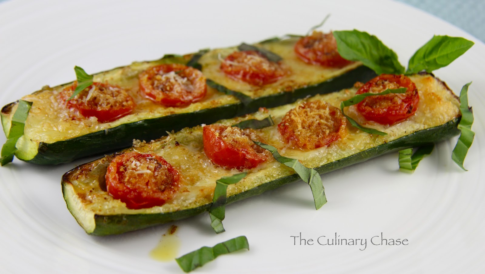 Preheat oven to 180c (350f). Cut the zucchini in half lengthways and scoop out the pulp (a teaspoon works well). Brush the surface with a mixture olive oil, garlic, salt and pepper. Place tomato halves into the grooves of the zucchini and lightly sprinkle with bread crumbs. Bake for 30 minutes. Remove from oven and place diced fontina or mozzarella in between the tomatoes. Turn broiler on and place zucchini under the broiler until golden and cheese is bubbling. Remove and drizzle with olive oil, a scattering of chopped basil and a sprinkling of grated parmesan.