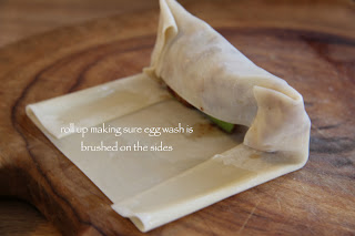 Preheat oven to 190c ( 375f). Place filling ingredients into a mixing bowl and stir together until well combined. Lay 1 egg roll wrapper onto a clean surface and brush edge with a 1 inch perimeter of egg wash.