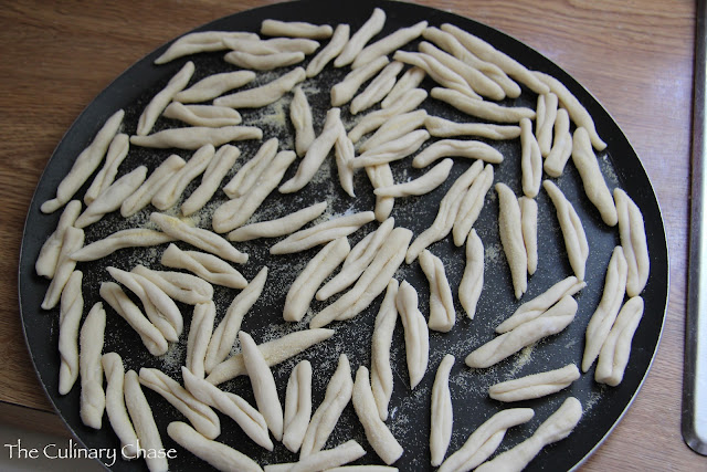 The Culinary Chase’s Note: I don’t have a cavatelli maker although I am tempted to get one (about $40 to $50 from Amazon), however, I was thinking about the pasta ladies on the street in Bari and they were only using a butter knife. Sure, the maker would make the pasta more pleasing to the eye, but there’s something more believable and rustic about hand made pasta without the intervention of machines. I just realized the photo of the older lady sitting at the end of her pasta trays is the same one in Jamie’s Italy cookbook!