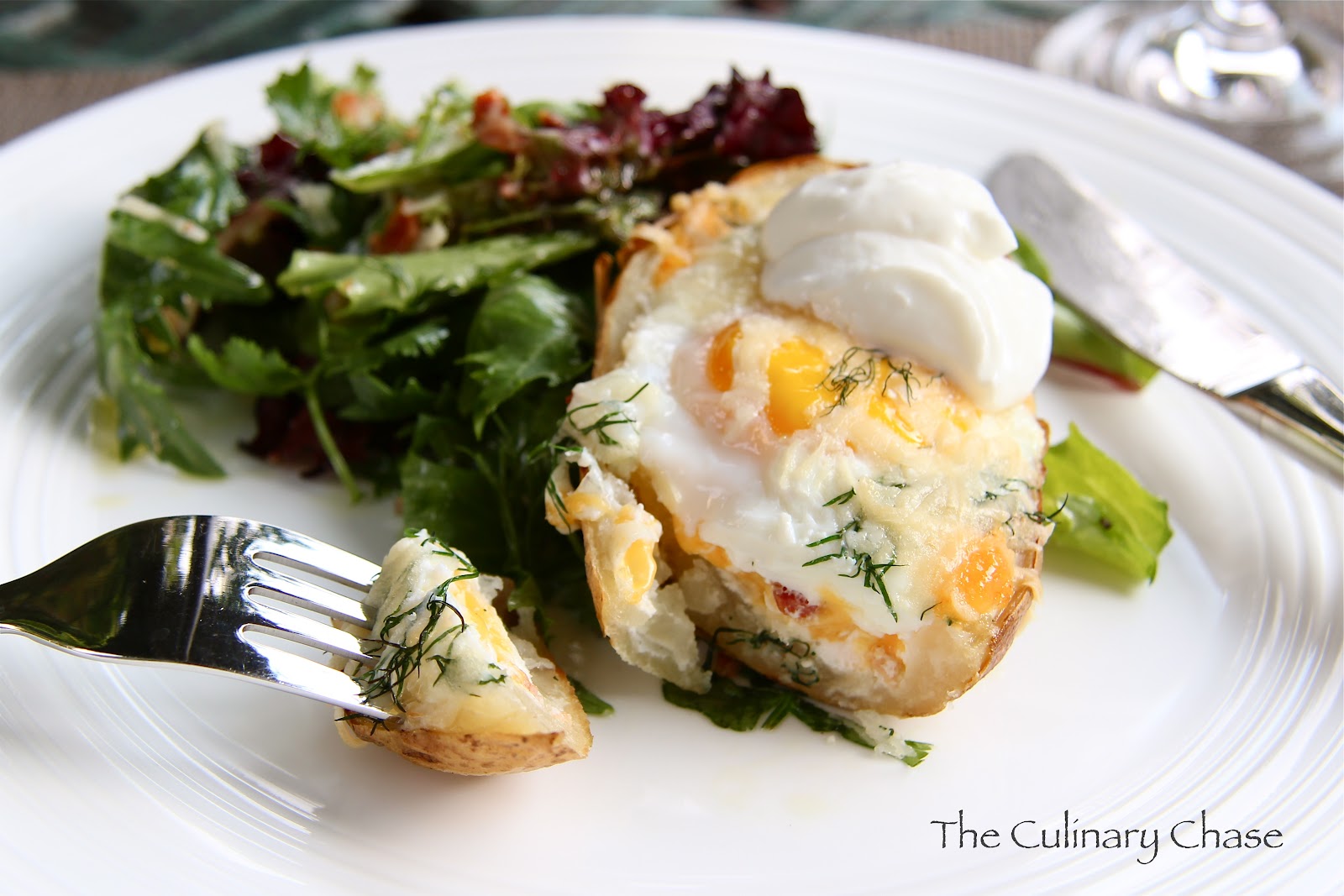 The Culinary Chase’s Note: Make sure the potato skins are deep enough to hold the egg otherwise the white of the egg will leak out. Enjoy!