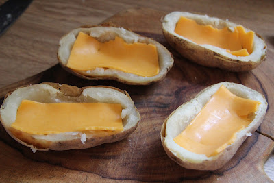 Remove from oven and when cool enough to handle cut each potato in half lengthwise and scoop out the flesh – save the potato for another dish. Place a slice of cheese on the bottom of the hollowed out potato skins.