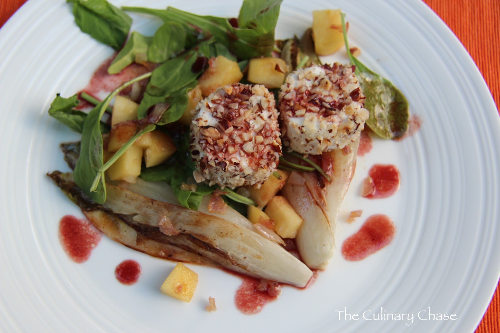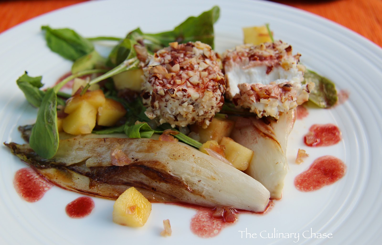 The Culinary Chase’s Cote: I love pan fried endive…a nutty flavor shines through and calms the somewhat bitter taste. Keep an eye on your oven when baking the cheese as the hazelnuts browned within 7 minutes. Warmed goat cheese atop this salad really helped to bring out all of the flavors. I will definitely make this one again. Enjoy!