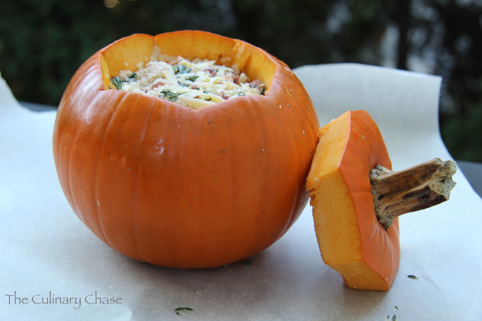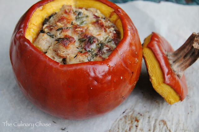 The Culinary Chase’s Note: The pumpkin is ready when the skin is pierced easily with the tip of a knife. Removing the top and baking an additional 20 minutes allows the liquid to bake away leaving the stuffing moist and cheesy! The flavors from this dish were so good! Serve with a simply dressed salad. Enjoy!
