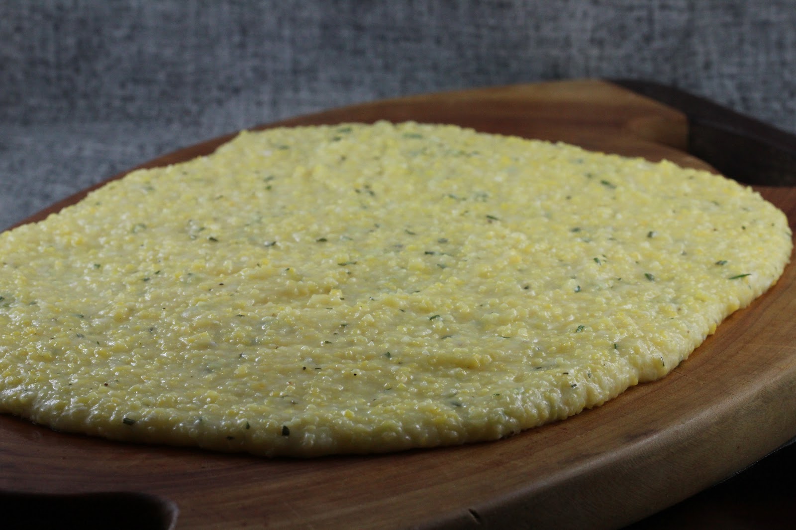 | polenta spread, ready for cheese & mushroom toppings (let polenta cool a bit before placing under broiler) |