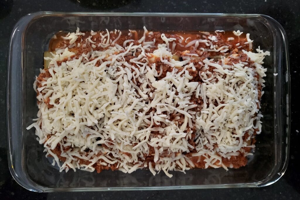 - Grab a 9×13 in (23×33 cm) glass dish and spoon a thin layer of the meat sauce on the bottom. Then add a single layer of roasted eggplant slices – as you can see by the above photo I used four spaced out evenly. Spread ricotta mixture on top of each eggplant slice then add marinara sauce. Sprinkle with shredded mozzarella cheese. Repeat the layers, ending with mozzarella last. Bake for 15 minutes or until the cheese on top is melted and golden.