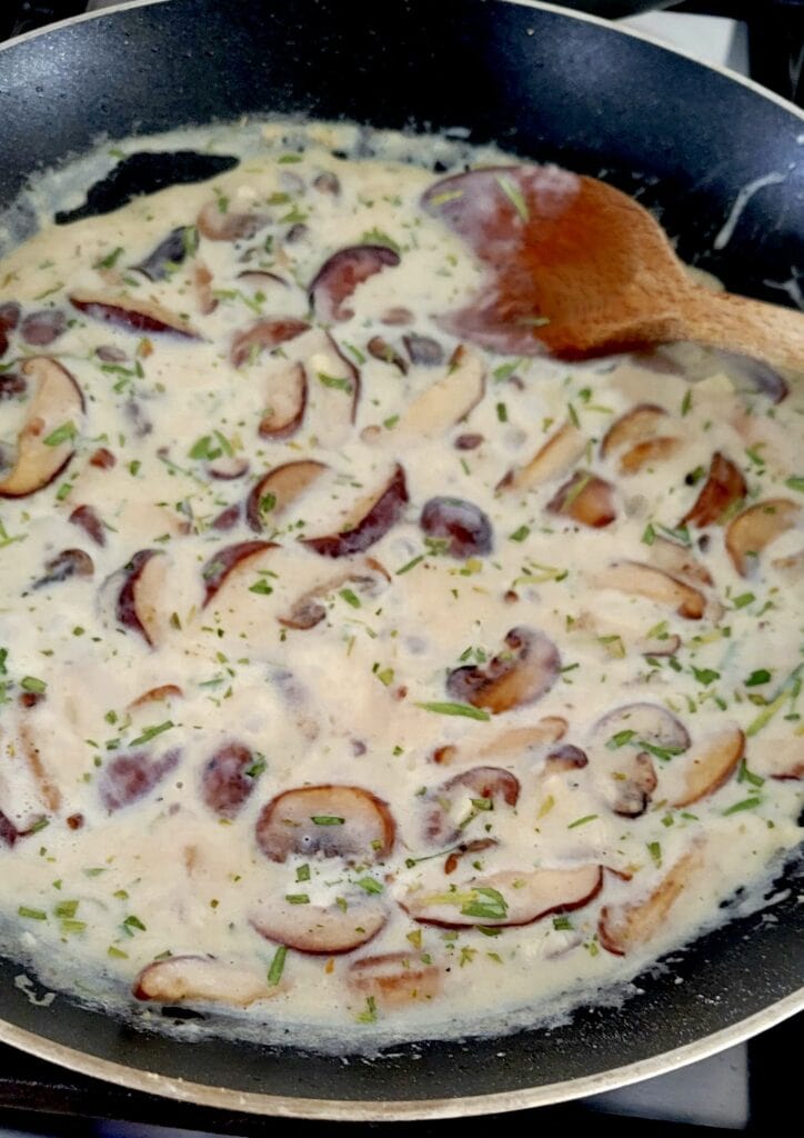 In a frying pan over medium heat, add two tablespoons of butter. When the butter has melted, add mushrooms. Cook 4 to 5 minutes then add garlic and dried tarragon. Stir until fragrant. Sprinkle the flour over the mixture and stir to combine. Cook for 1 minute. Add milk and simmer for a couple of minutes. Decrease the heat to medium-low. Cook until the mixture thickens, stirring occasionally, approximately 6 to 8 minutes.