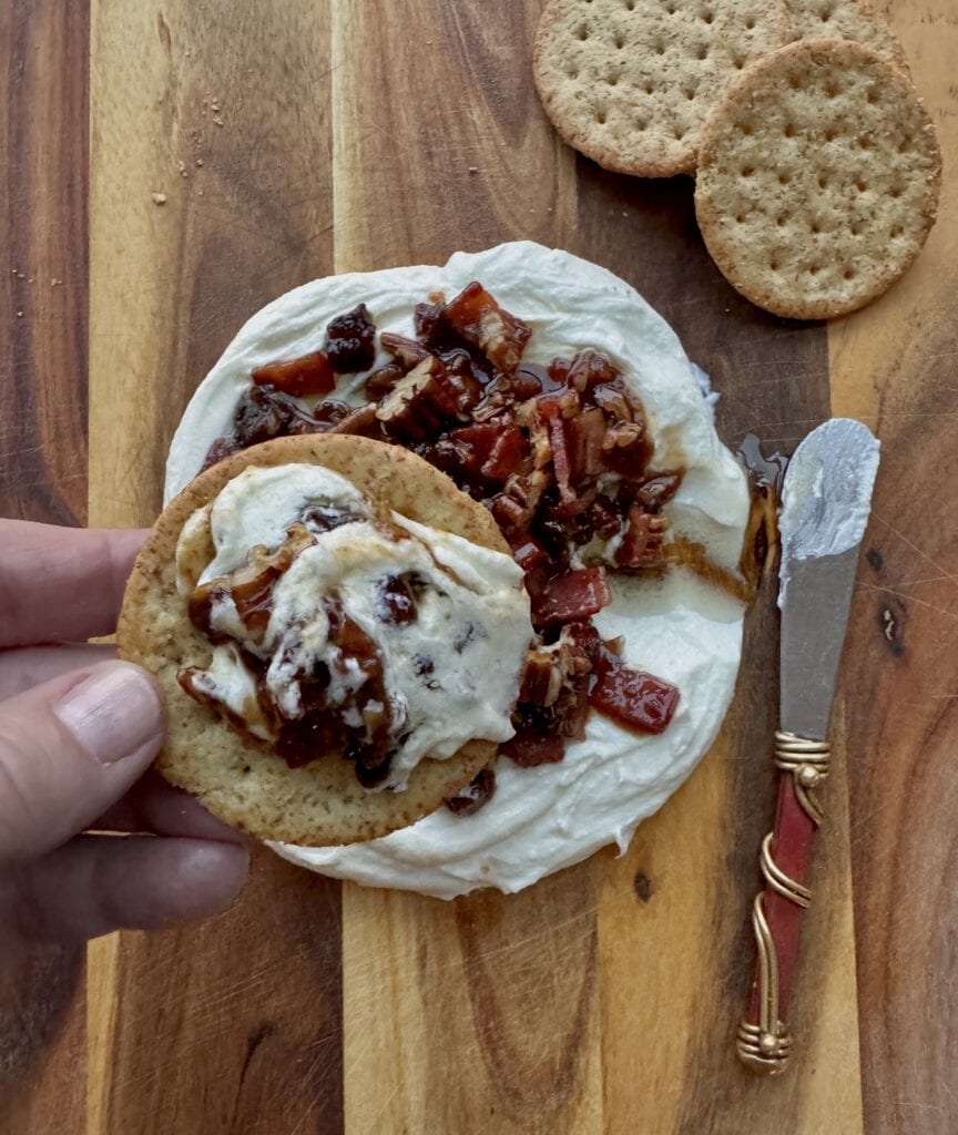 Take a serving dish and smooth out the goat cheese. Top with bacon ingredients. Serve with crackers or toasted bread.