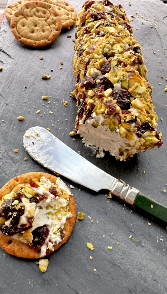 Cheese logs are a nostalgic holiday classic. They were wildly popular in the ’50s and ’60s and still beloved today. My mom used to make hers with mixed cheeses, a splash of Worcestershire, shaped into a log and rolled in nuts and herbs. They always remind me of festive Christmas gatherings. The beauty is you can use any cheese you like. Also, goat cheese works wonderfully, and Boursin (I used garlic and fine herbs) is perfect since it’s already soft and flavoured.